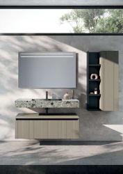 Questa composizione bagno sospesa è pensata per chi cerca un arredo moderno, funzionale e curato nei dettagli. La base con ampio cassetto, il lavabo HPL con finitura cepp stone e il top tortora creano un insieme elegante e ben equilibrato. La specchiera illuminata e le colonne laterali completano l’arredo con praticità e stile, mentre la possibilità di personalizzazione rende la composizione adatta a diverse esigenze di spazio.