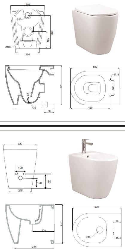 Sanitari senza brida bianchi lucidi filo parete serie UNO MINI con coprivaso soft close