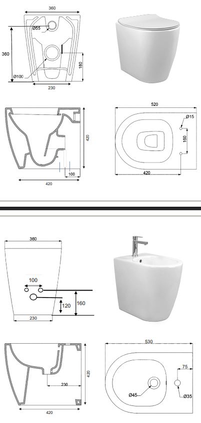 Dimensione 53x36x42 cm per il wc e 53x36x42 cm per il bidet.